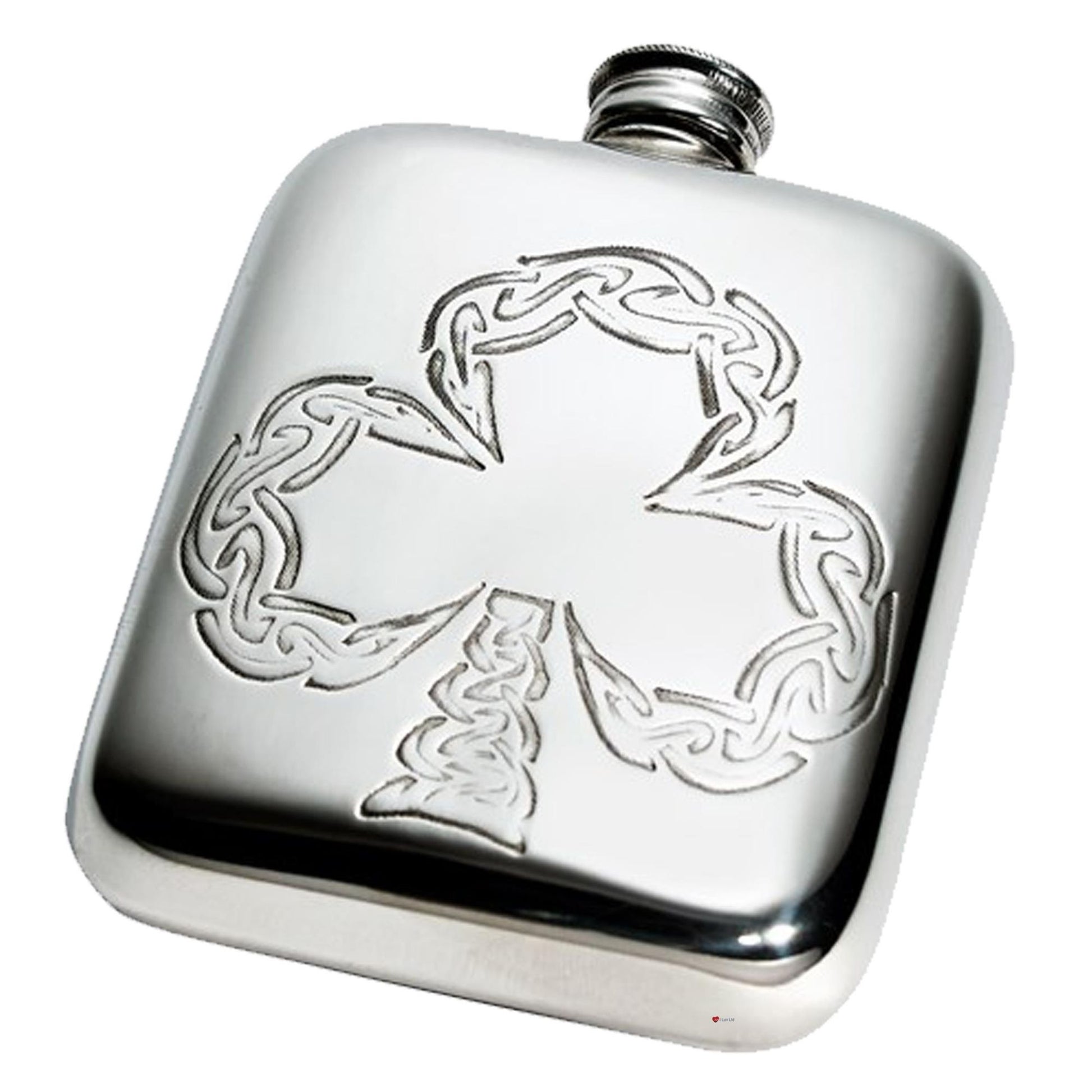 4oz Pewter Flask Large Celtic Shamrock Pattern Embossed Bright Polished Screw