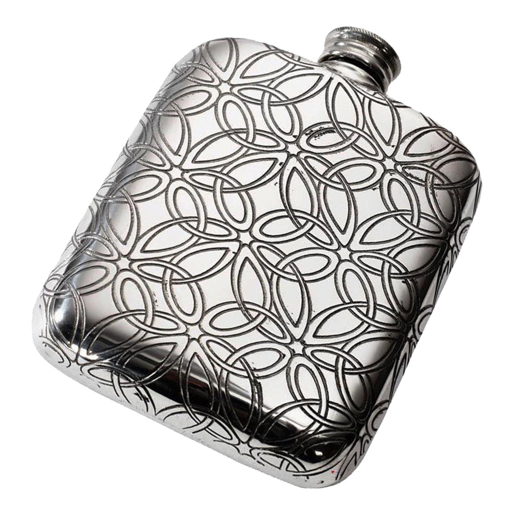 4oz Pewter Hip Flask Embossed Design Triquetra Pattern Polished Screw Top