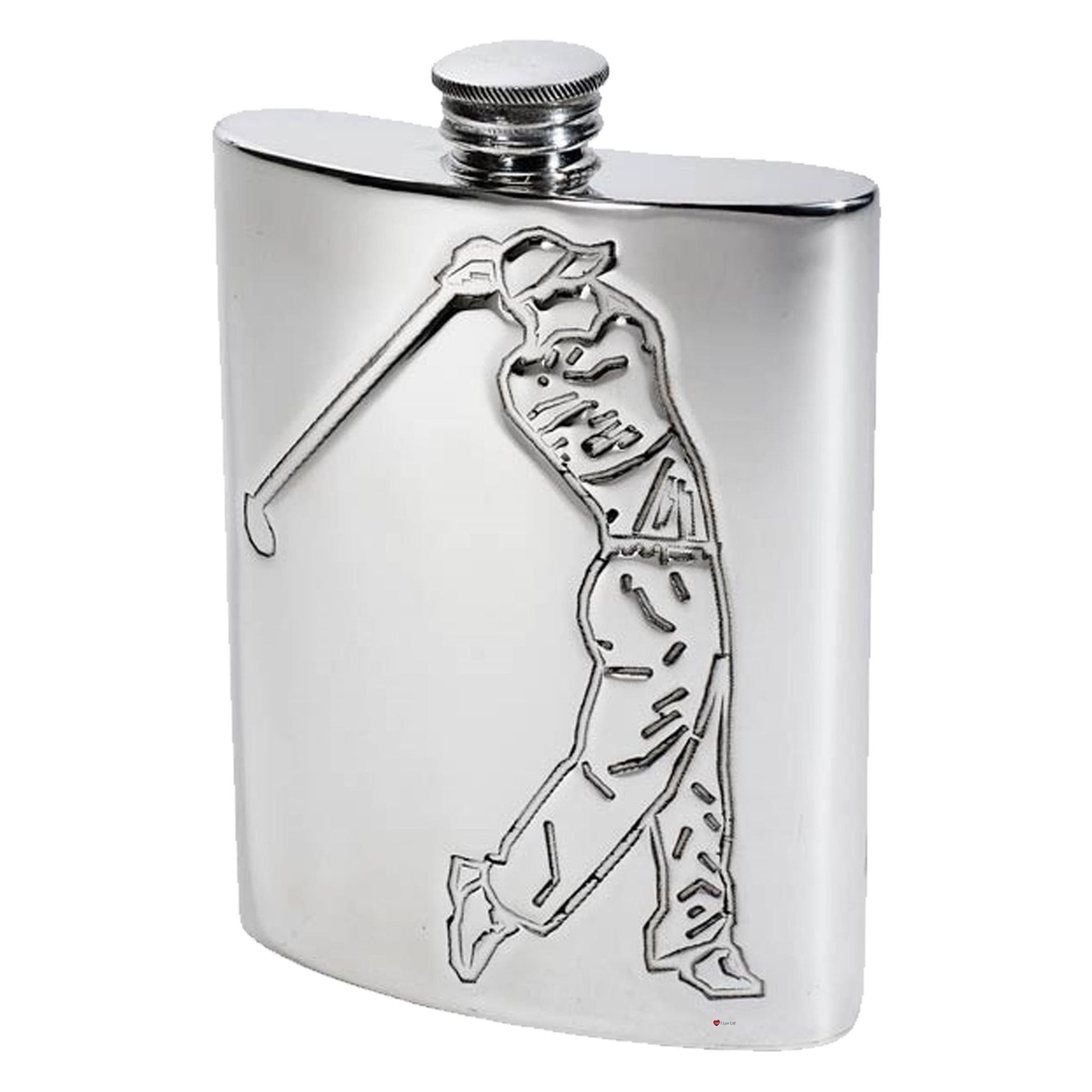 6oz Hip Flask Pewter with Golfer Driving Scene Bright Polished Finish Screw Top