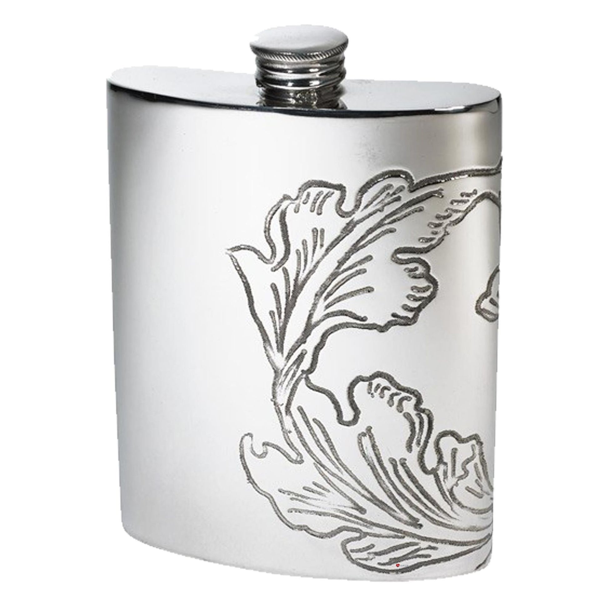 6oz Pewter Hip Flask Acanthus Leaf Decoration Pattern Bright Polished Screw Top