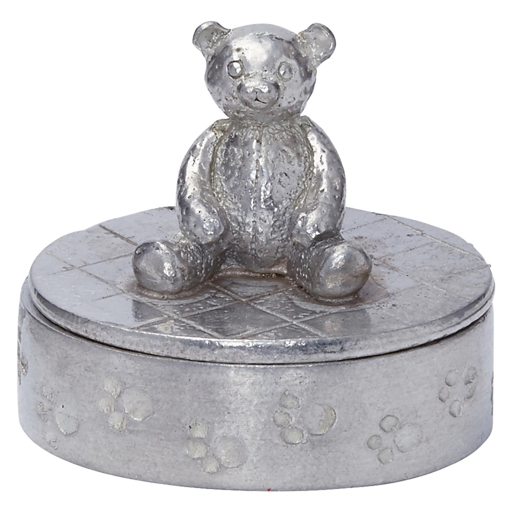 Child's Pewter Trinket Box Cute Teddy Bear on Top in Oval Paw Prints on Body