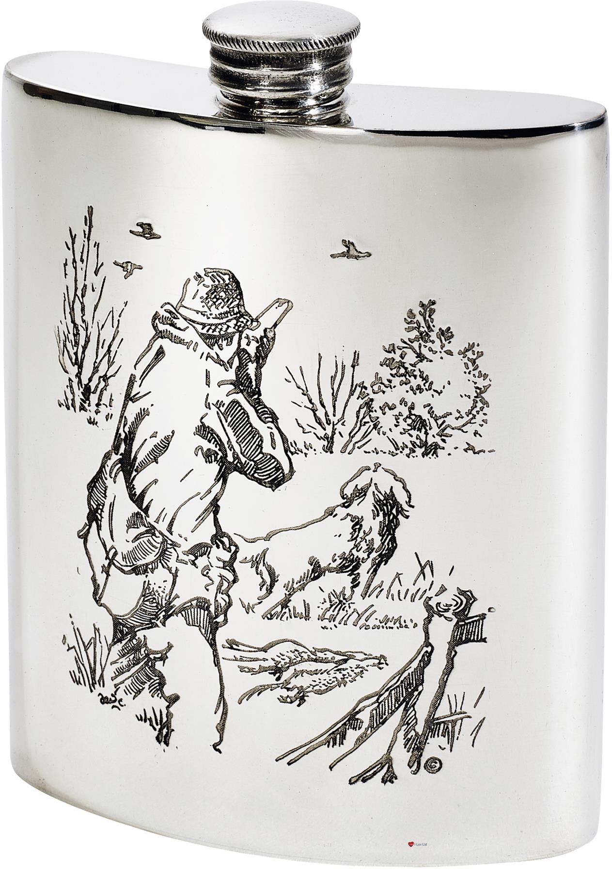 Kidney Shaped Flask 6oz Pewter with Shooting Scenes on Both Sides