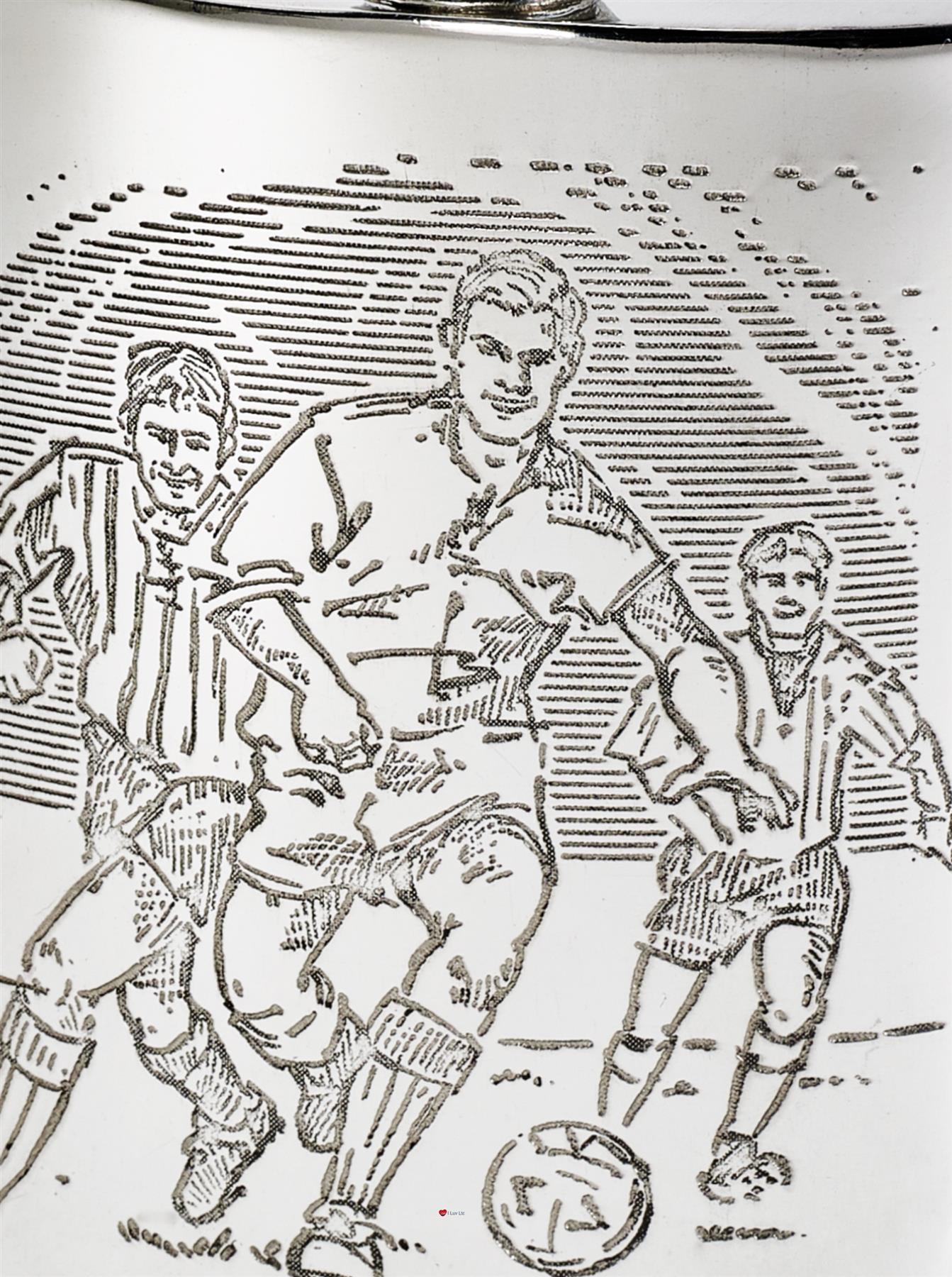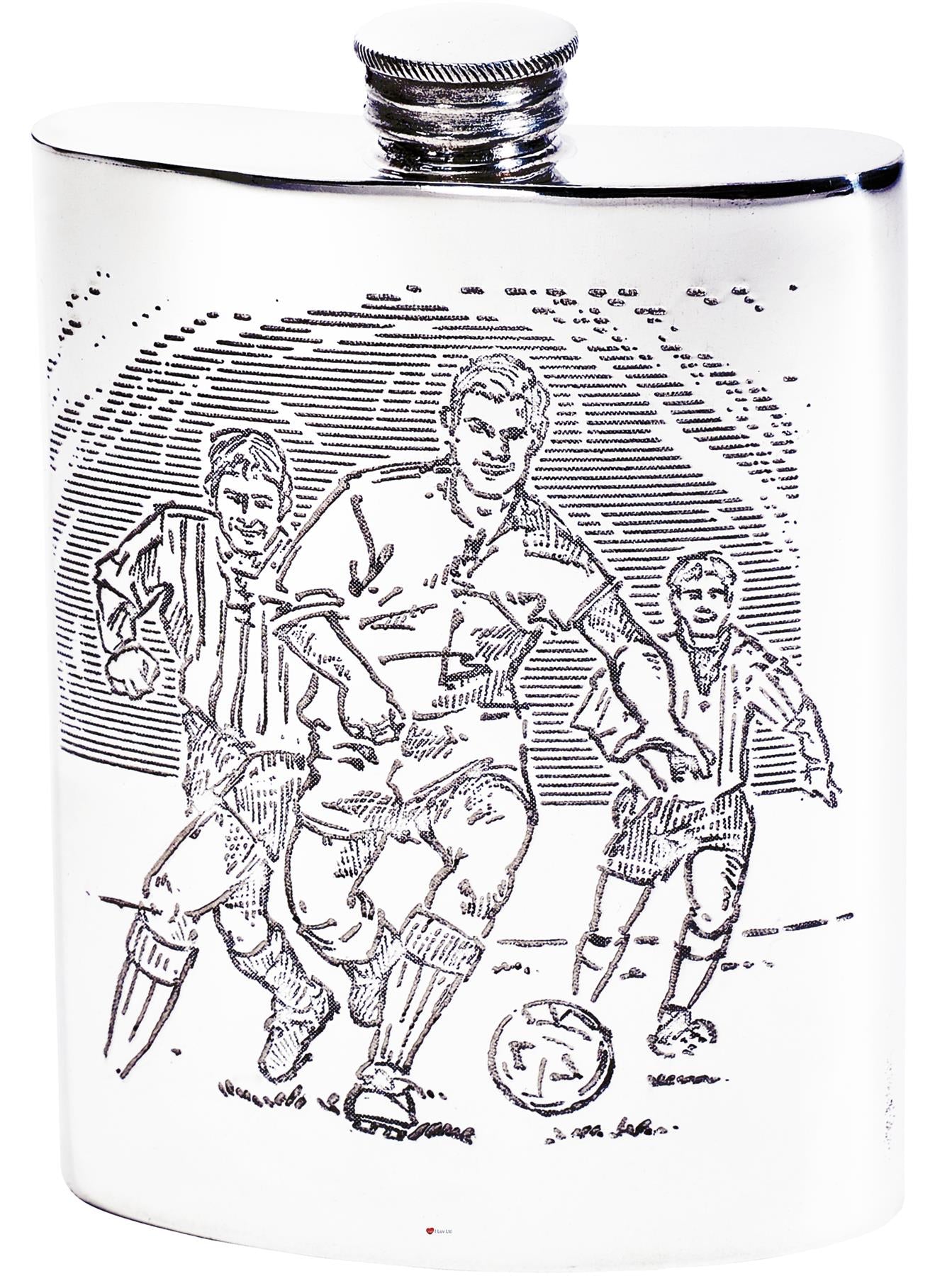 Kidney Shaped Flask 6oz Pewter with Soccer Scenes on Both Sides