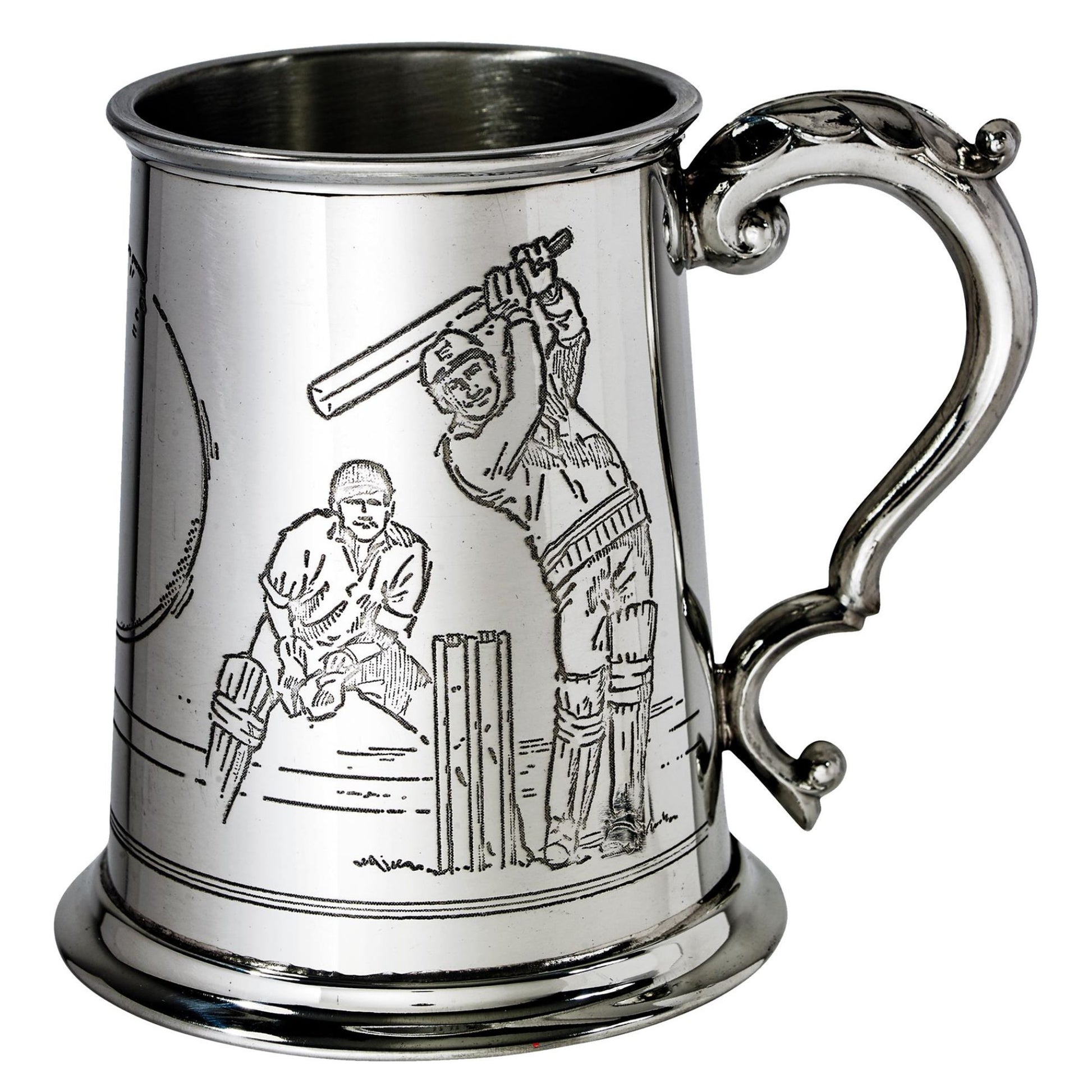 Pewter Tankard 1 Pint with Cricket Scenes on Both Sides and Antique Handle