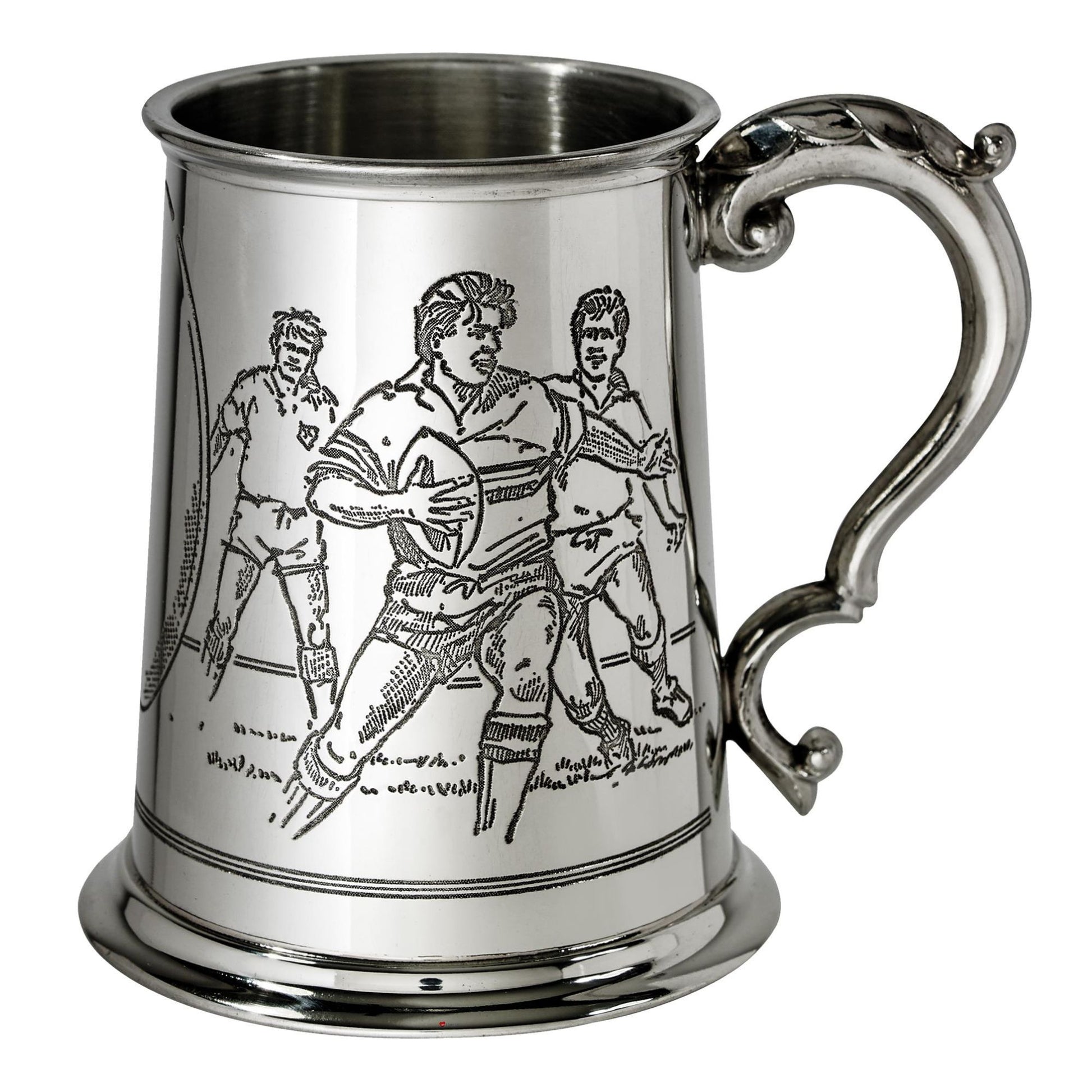 Pewter Tankard 1 Pint with Rugby Scenes on Both Sides and Antique Handle