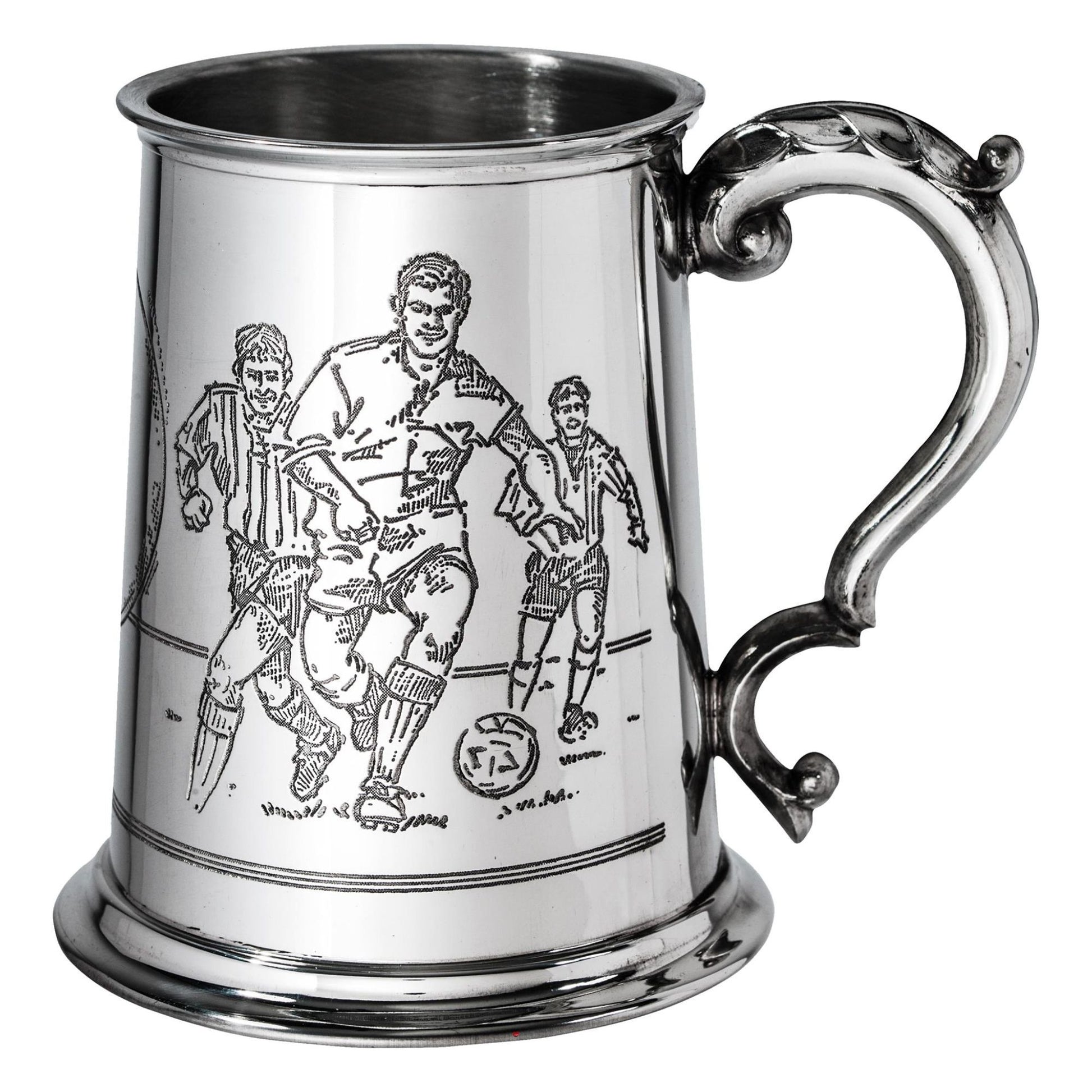 Pewter Tankard 1 Pint with Soccer Scenes on Both Sides and Antique Handle
