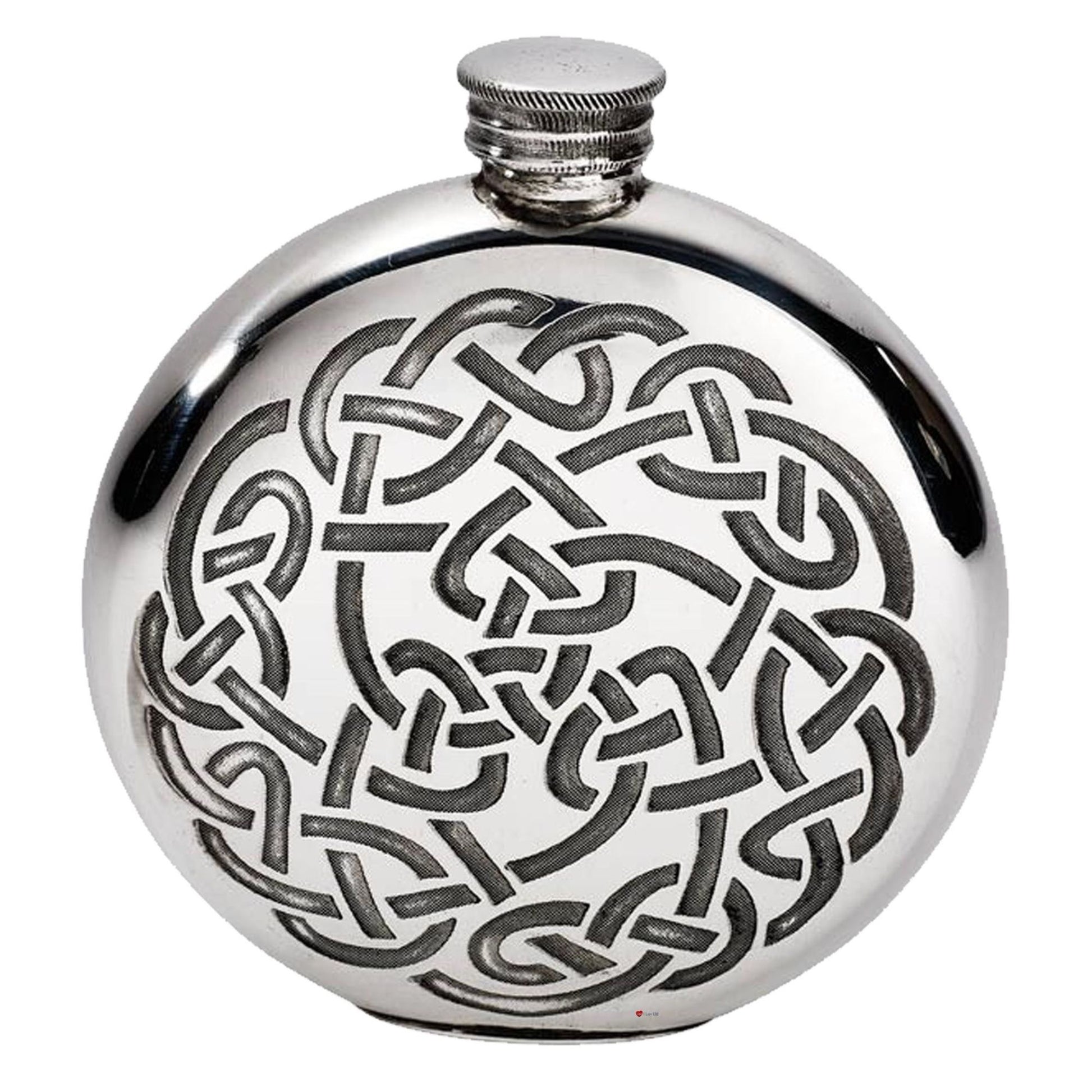 Round Pewter 6oz Flask Celtic Knot Design Polished Screw Perfect for Engraving
