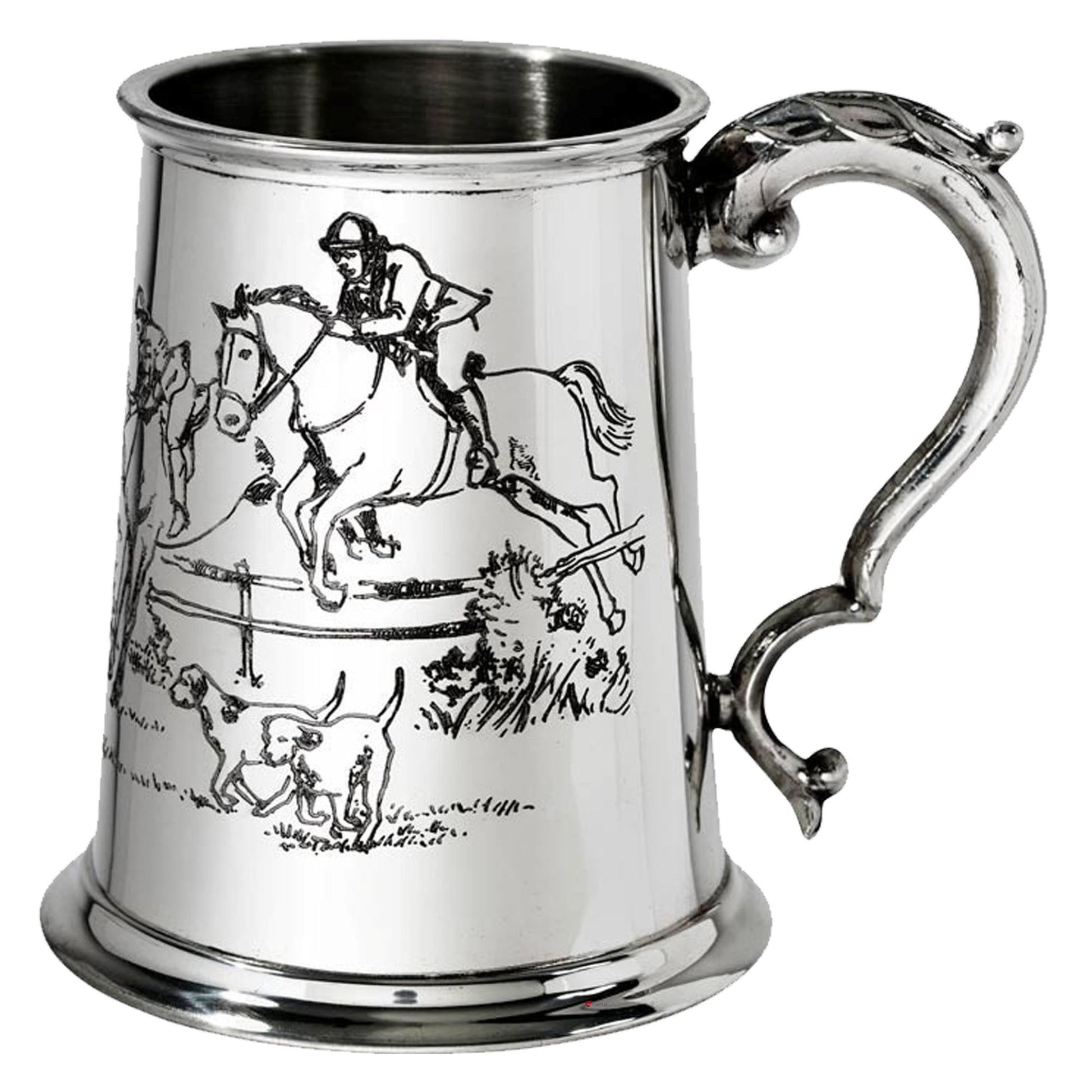 Tankard 1 Pint British Hunting Scene Embossed on Front and Back Scroll Handle